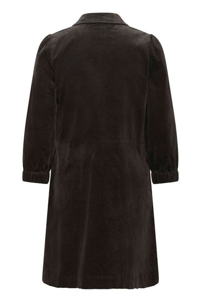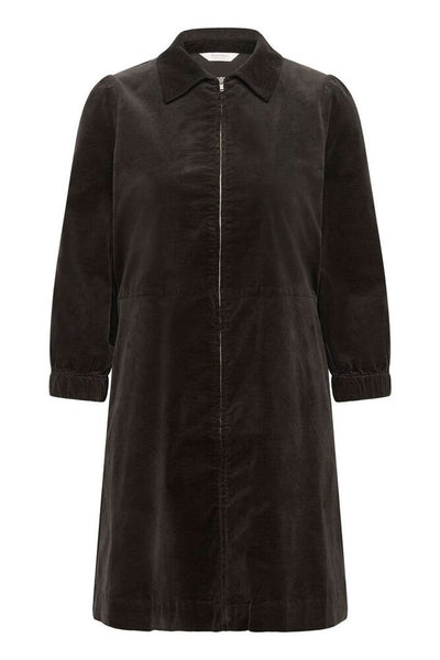 Das Model ist 174 cm groß und trägt Größe 36. Dieses knielange Kleid aus weichem Cord ist mit kurzen Ärmeln, einem Frontreißverschluss und einem klassischen Kragen ausgestattet. Die Passform ist leicht ausgestellt für eine entspannte Silhouette. Ideal kombiniert mit Strumpfhose und Stiefeln für den Herbst.
