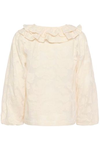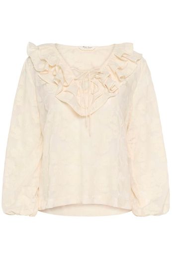 Das Model ist 172 cm groß und trägt Größe 36. Diese leichte Bluse aus transparenter Jacquardqualität ist mit voluminösen Rüschen und einem Bindeband am Ausschnitt versehen. Die langen Ärmel haben elastische Abschlüsse und sorgen für eine weiche Silhouette. Ideal zu Jeans oder Rock – für den Alltag oder ein Abendessen.